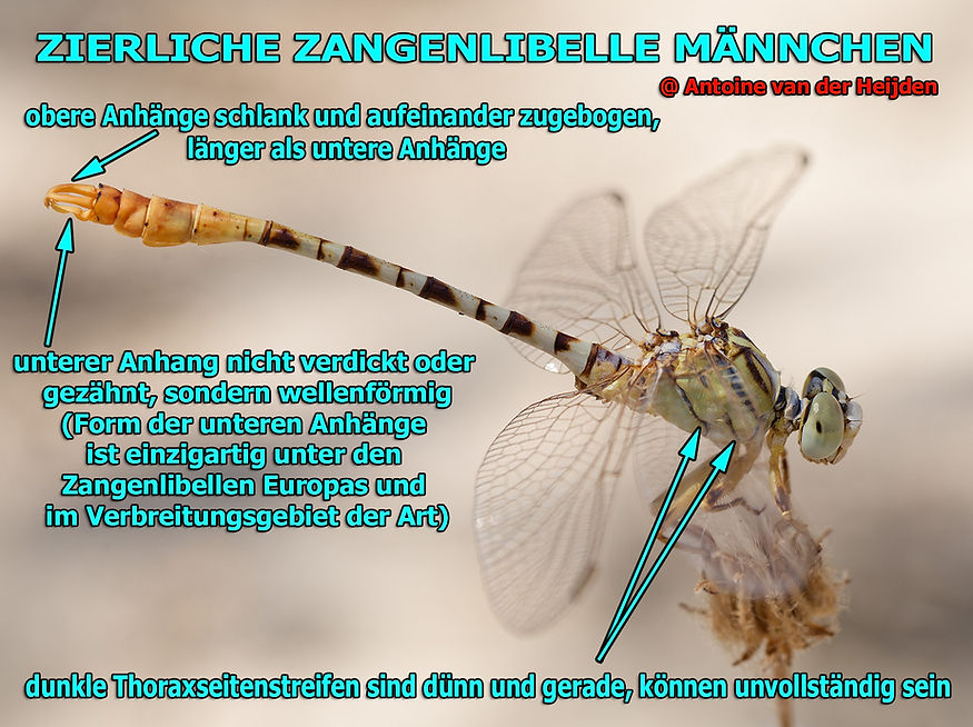 Detaildarstellung der Unterschiede in der Gestaltung von Thorax und Anhängen bei den Unterarten der Kleinen Zangenlibelle, und den sonstigen in Europa vorkommenden Zangenlibellenarten im Schaubild: